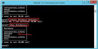 Disini Kita buat Database baru dengan perintah create database (nama database); setelah itu jika kita ingin mengedit atau mengisi dalam Database itu atau lebih tepatnya menggunakannya masukkan saja perintah use (nama database); Selanjutnya file database yang sudah kita buat kita coba gunakan dengan perintah use nama database.